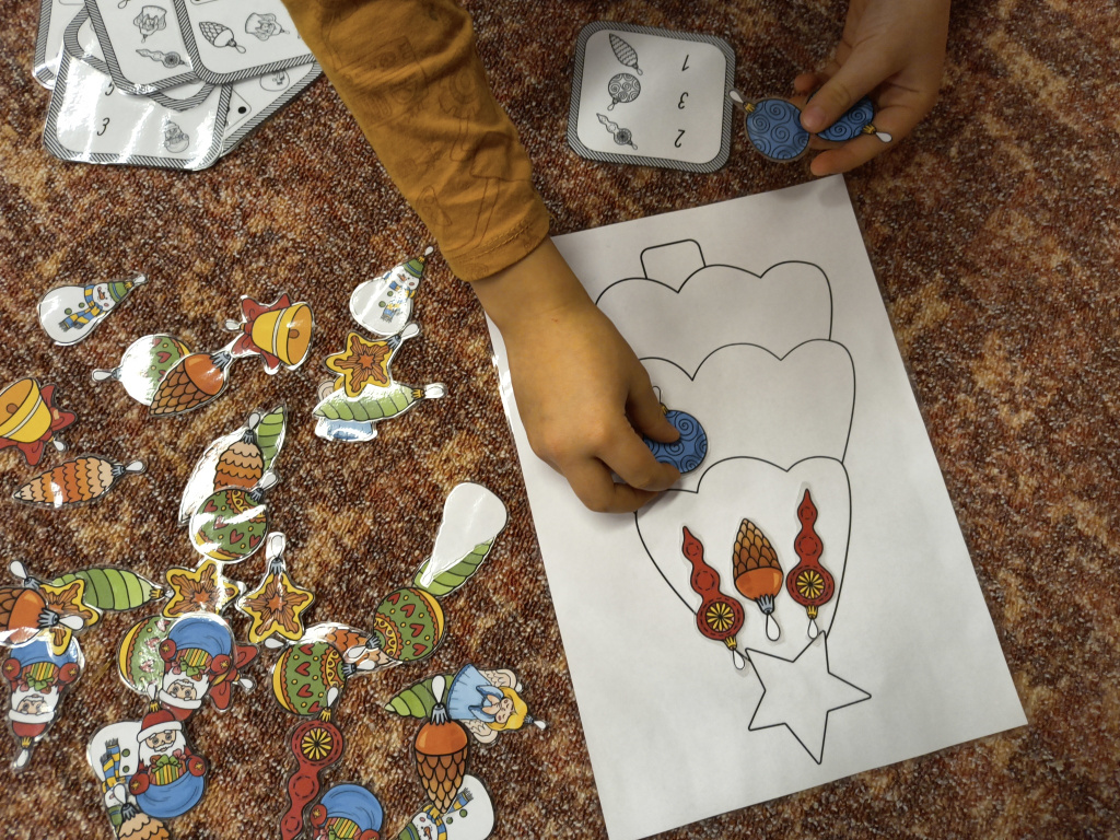 První aktivita je jednodušší. Úkolem dětí je ke stínům na vánočním stromku přiřadit správnou barevnou variantu ozdob. Při práci s druhou aktivitou si děti procvičí počítání do 5. V tomto případě děti na podkladovou kartu se stromečkem umisťují ozdoby podle předlohy. Kartičky se zadáním obsahují 2 nebo 3 vybrané ozdoby v určitém množství. Ozdoby tedy dítě podle zadání vybere a „zavěsí“ na stromeček.